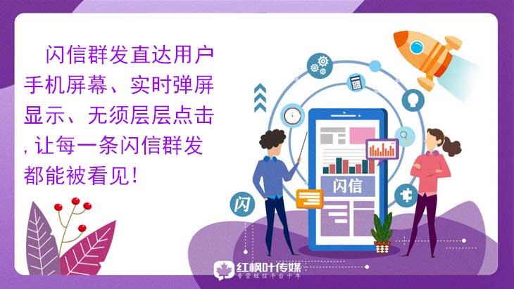 紅楓葉閃信群發79元起充、每條僅需幾分錢、高性價比、按需付費、24小時發送、快速實現商用。未來已來,紅楓葉閃信群發業務喚醒商機,讓閃信群發帶著品牌飛,紅楓葉閃信群發平臺、海量名企的選擇,十年通信技術服務及經驗,無延時,秒級觸達,99%以上閃信5秒內觸達,閃信群發平臺紅楓葉傳媒